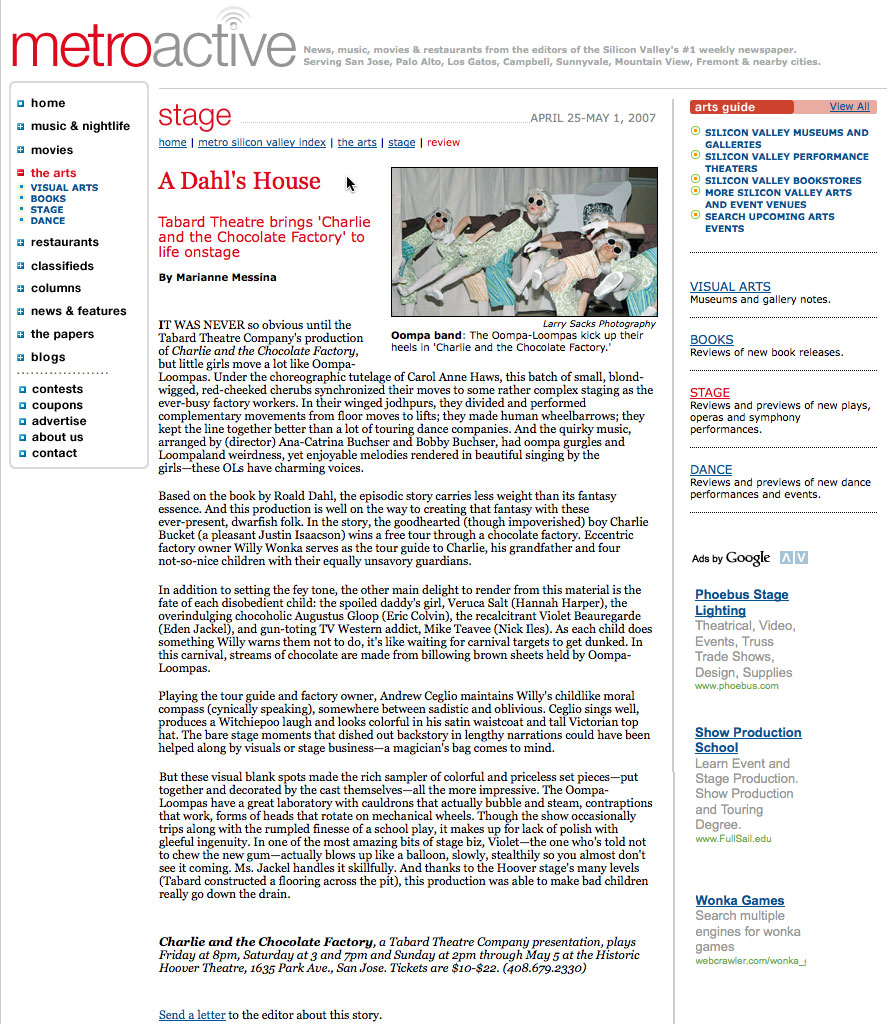 Creative and Fun. “Tabard is known for their creative approach and this show is no exception. The well cast, fun adaptation of the book is full of minimilist but magical effects, and lots of laughs. the creative two sided staging was challenging, but I think they handled it well, and though the sound could use some tweaking in terms of levels, and mics, the colorful costuming, and props, not to mention the very cute kids, made this an enjoyable evening. Just 1 1/2 hours, and an entertaining intermission certainly makes this a worthwile show to take the family to.”